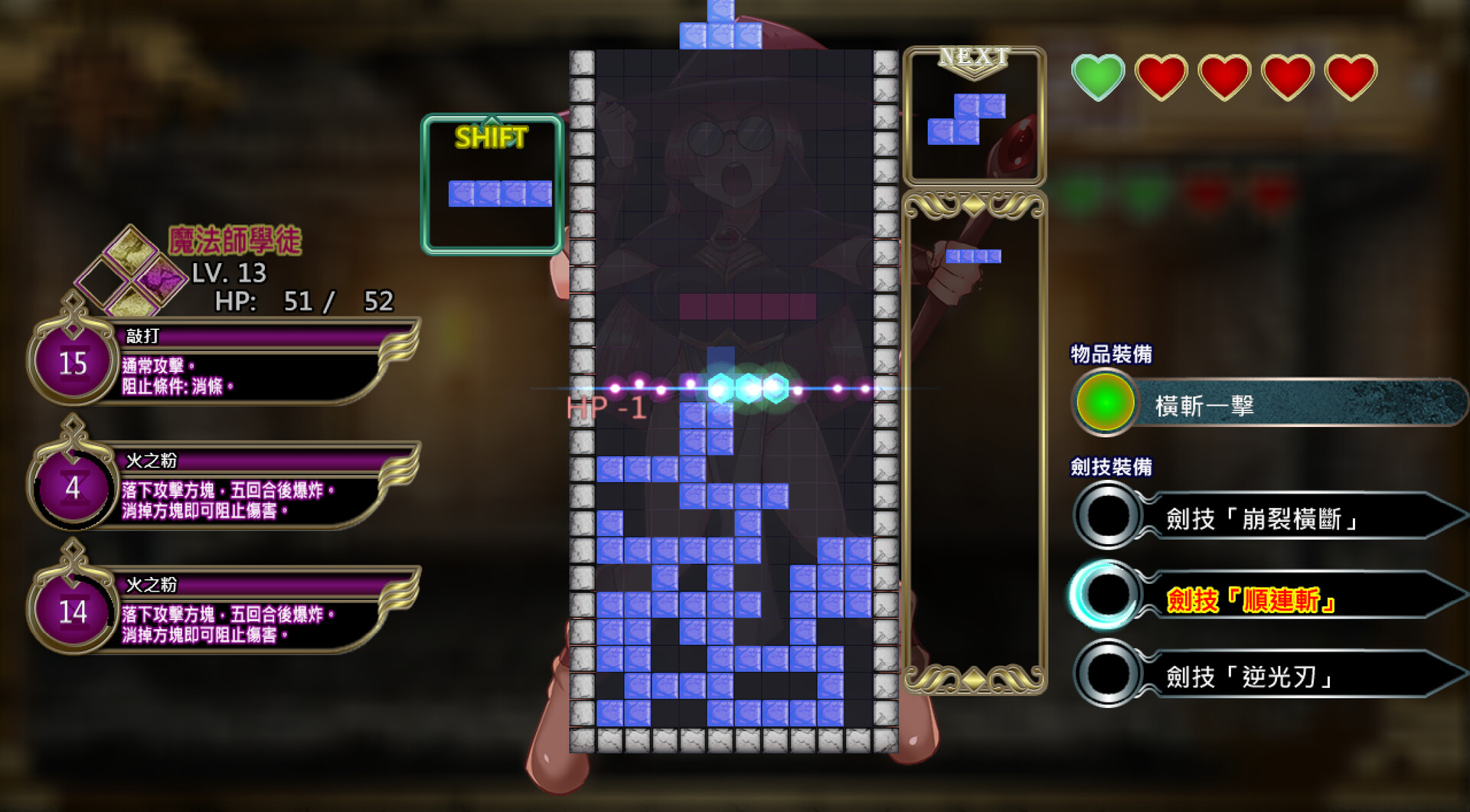 如果沒有在限制的方塊數內,給予至少一擊橫斬的話,就會遭到敵人的攻擊,務必留意。